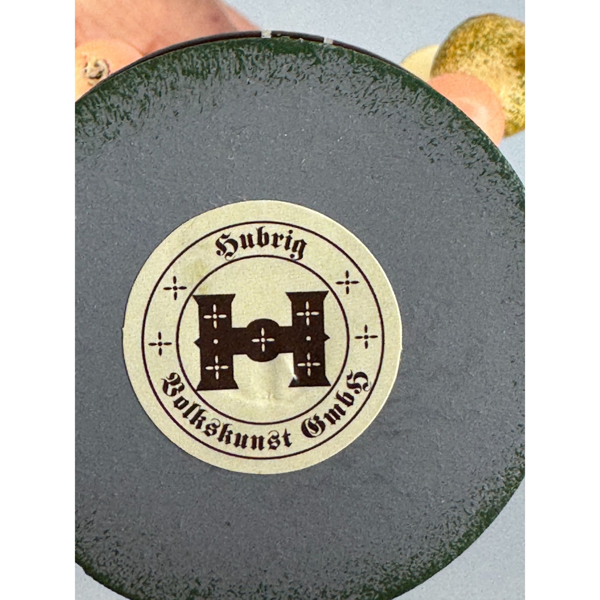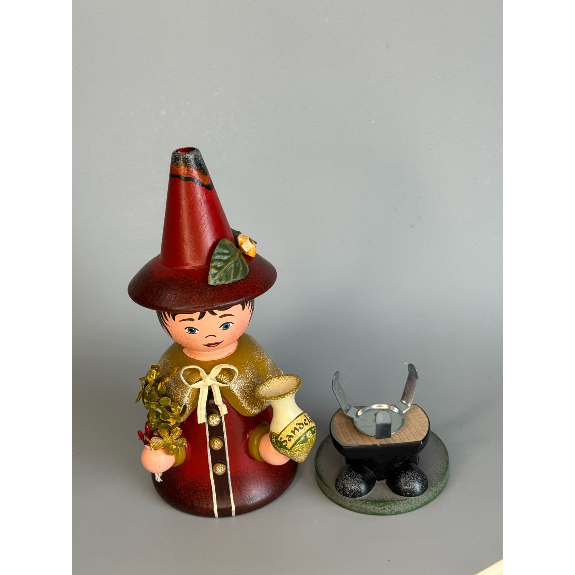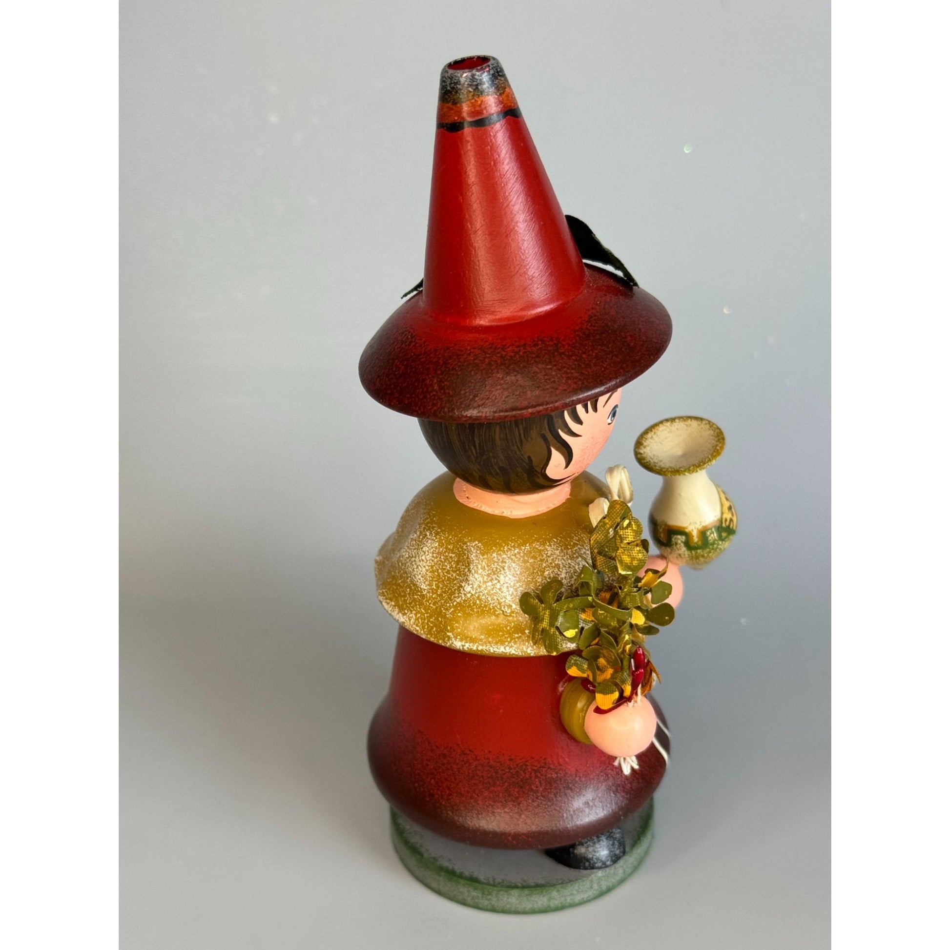 Adorable Hubrig Volkskunst wooden incense smoker that looks like a sweet little witch girl, complete with a tall pointed red hat and shimmering gold cape. She’s holding greenery and a small vase hand-lettered “Sandelot,” and the smoke drifts out through the opening at the top of her hat. Marked with the Hubrig Volkskunst GmbH label on the underside.