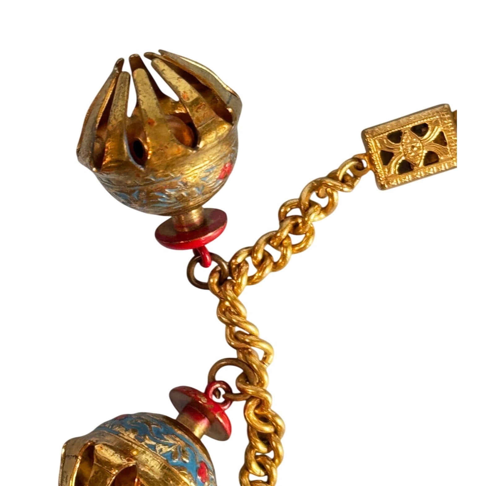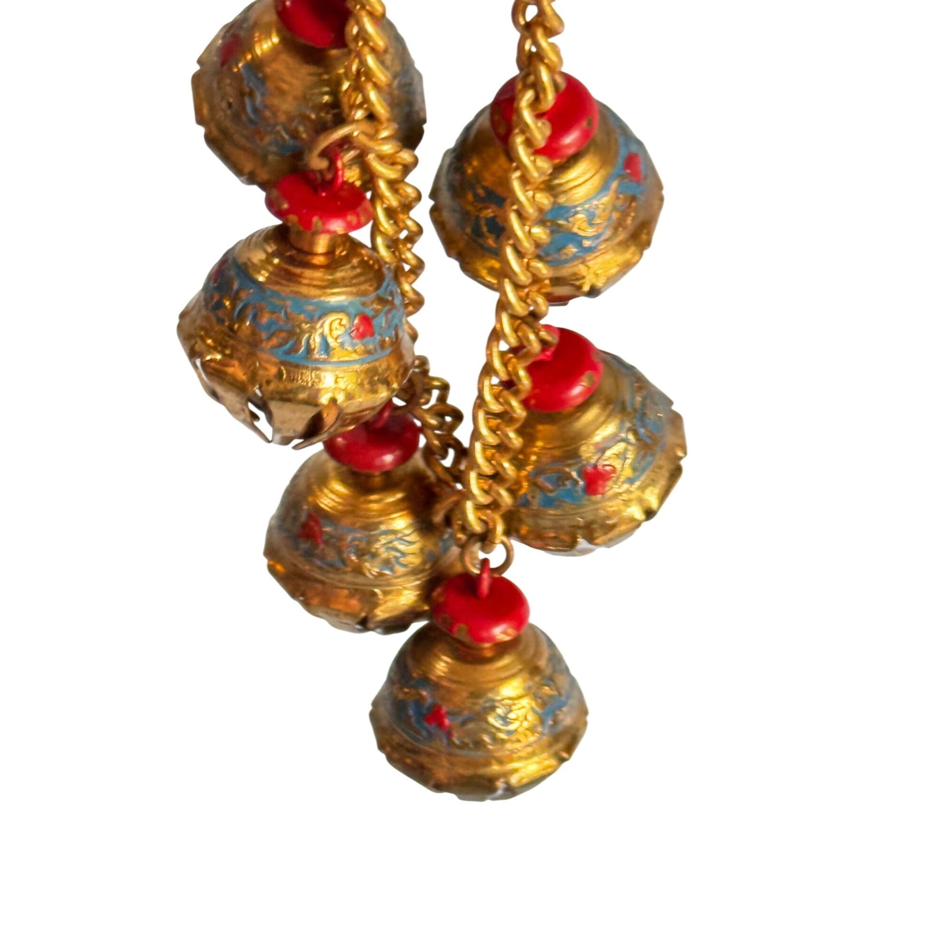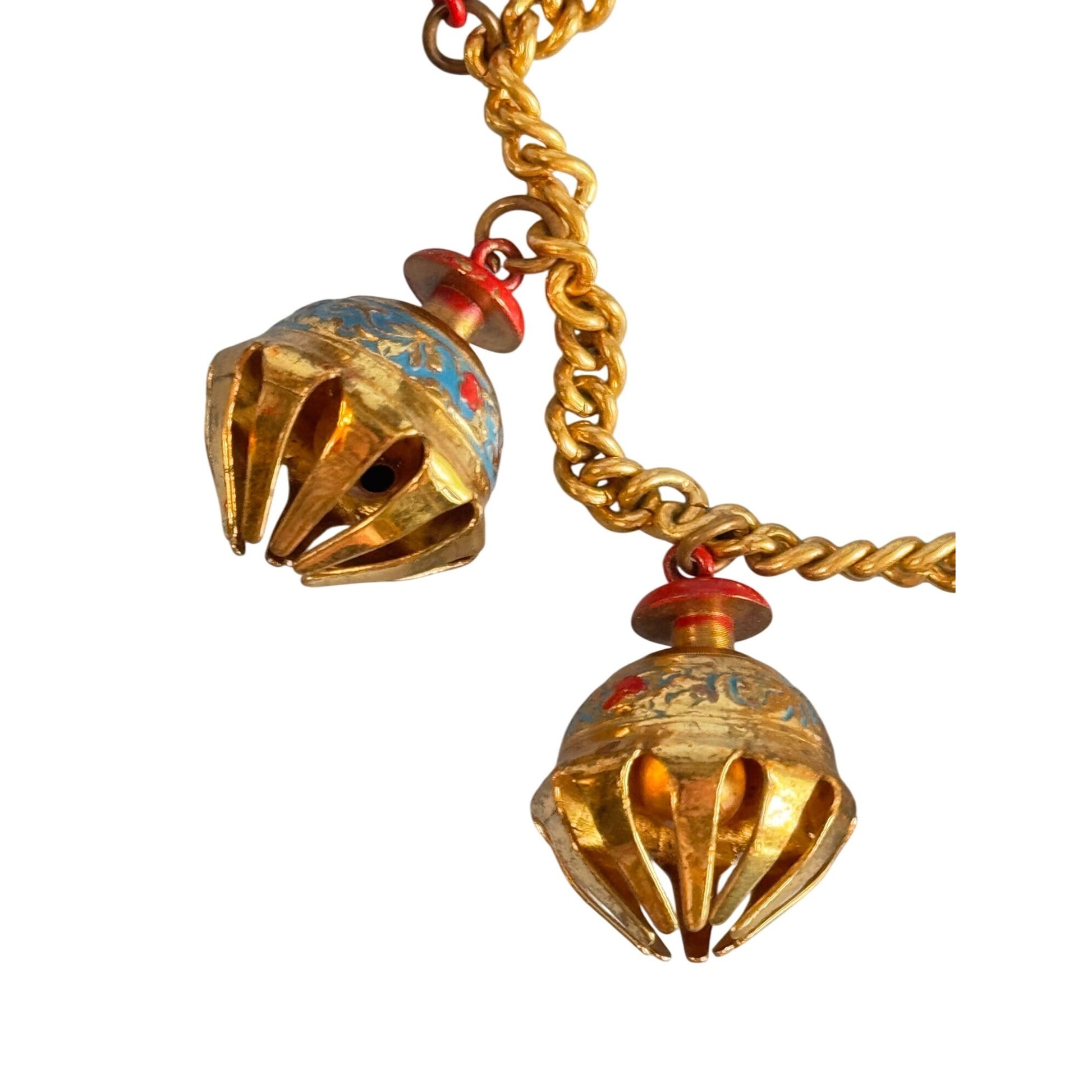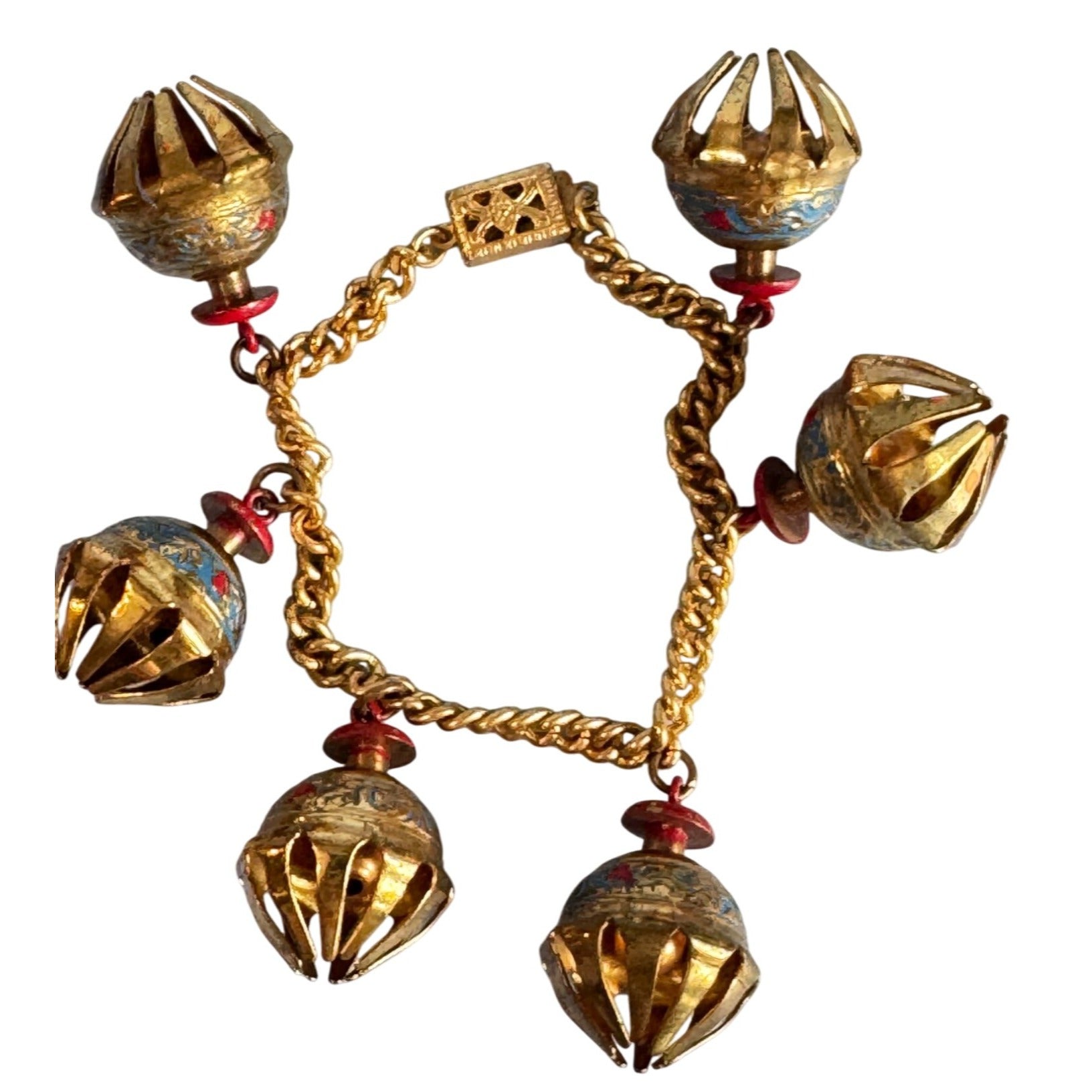 This handcrafted India charm bracelet features intricate elephant claw-inspired gold-tone metalwork and dangling bell charms with blue and red accents. The 6.5-inch chain is secured with a decorative clasp, adding cultural and artistic appeal to the jewelry piece. Ideal for adding a vibrant touch to your accessories.