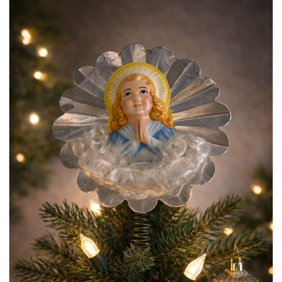 Classic vintage tree topper featuring a sweet praying blowmold angel with a bright yellow halo, shiny foil wings/backing, and fluffy spun cotton trim across the front. The spring-style base slips right over the top branch for that nostalgic vintage Christmas look.