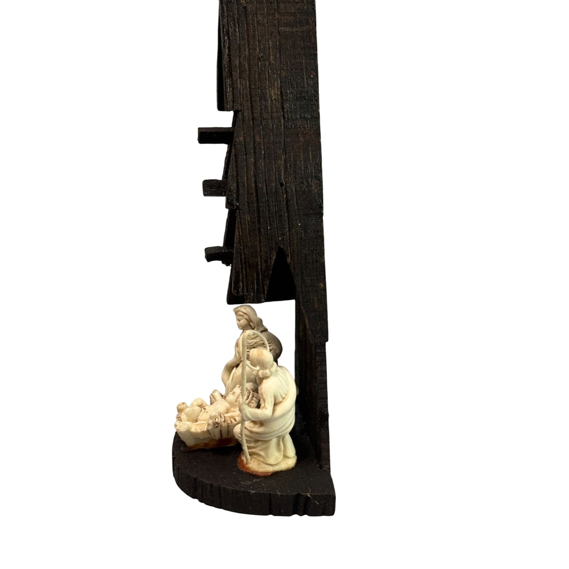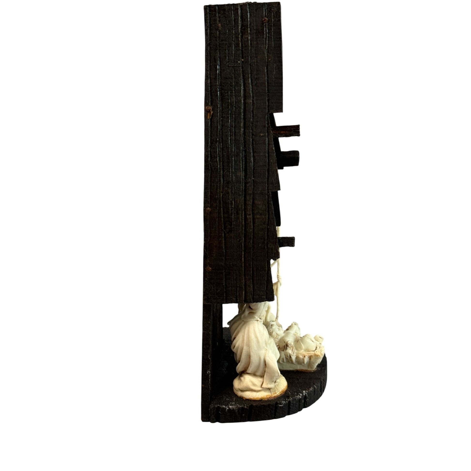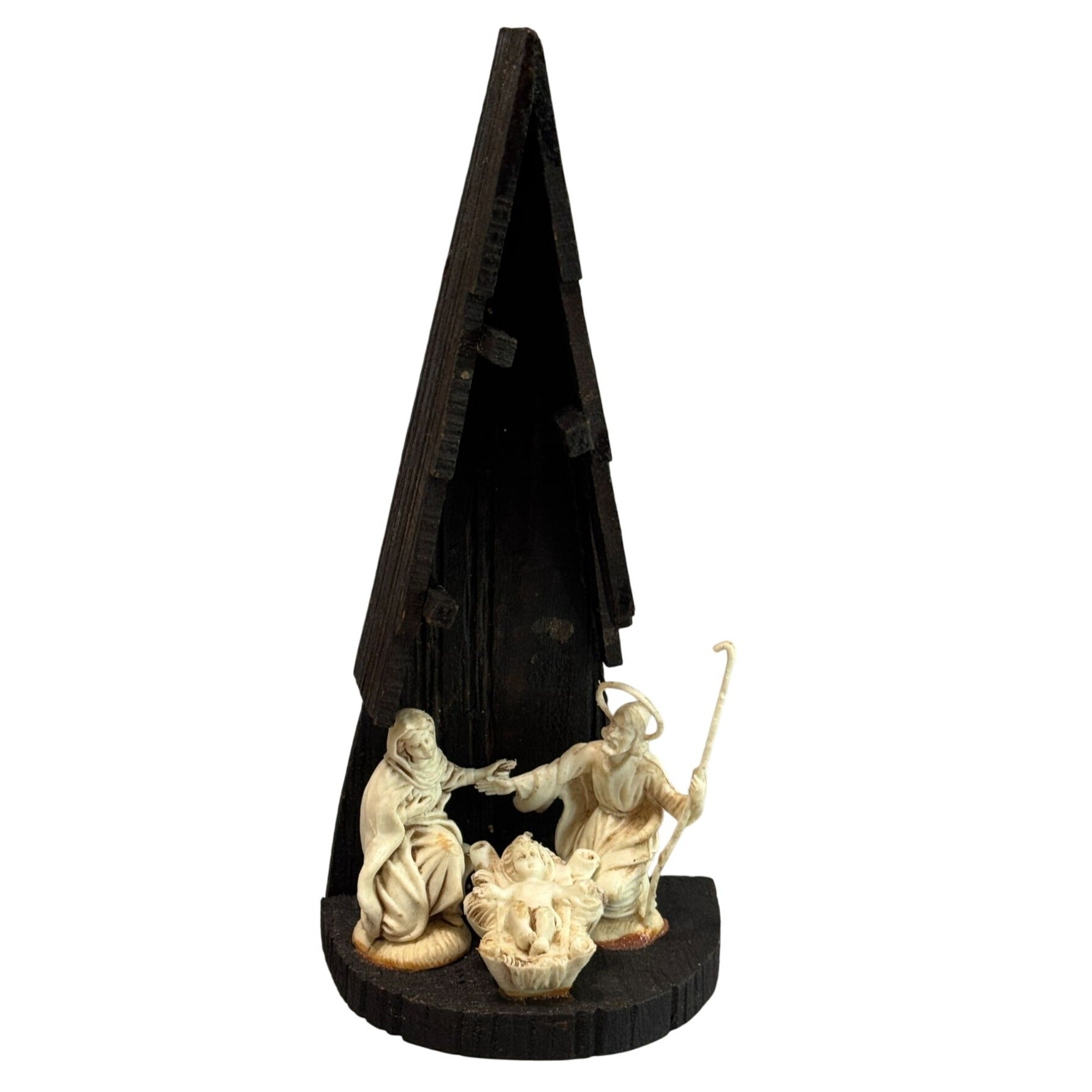 This mid-20th-century vintage nativity scene features cast resin/polymer figures of Mary, Joseph, and Baby Jesus housed in a black wood stable structure. Standing approximately 10.5 inches tall, this piece represents craftsmanship from Italy during the 1960s–1970s. The detailed figures highlight the holy family's expressions and gestures, while the dark wood backdrop creates an authentic and rustic aesthetic. A hallmark religious collectible combining artistry and historical value.