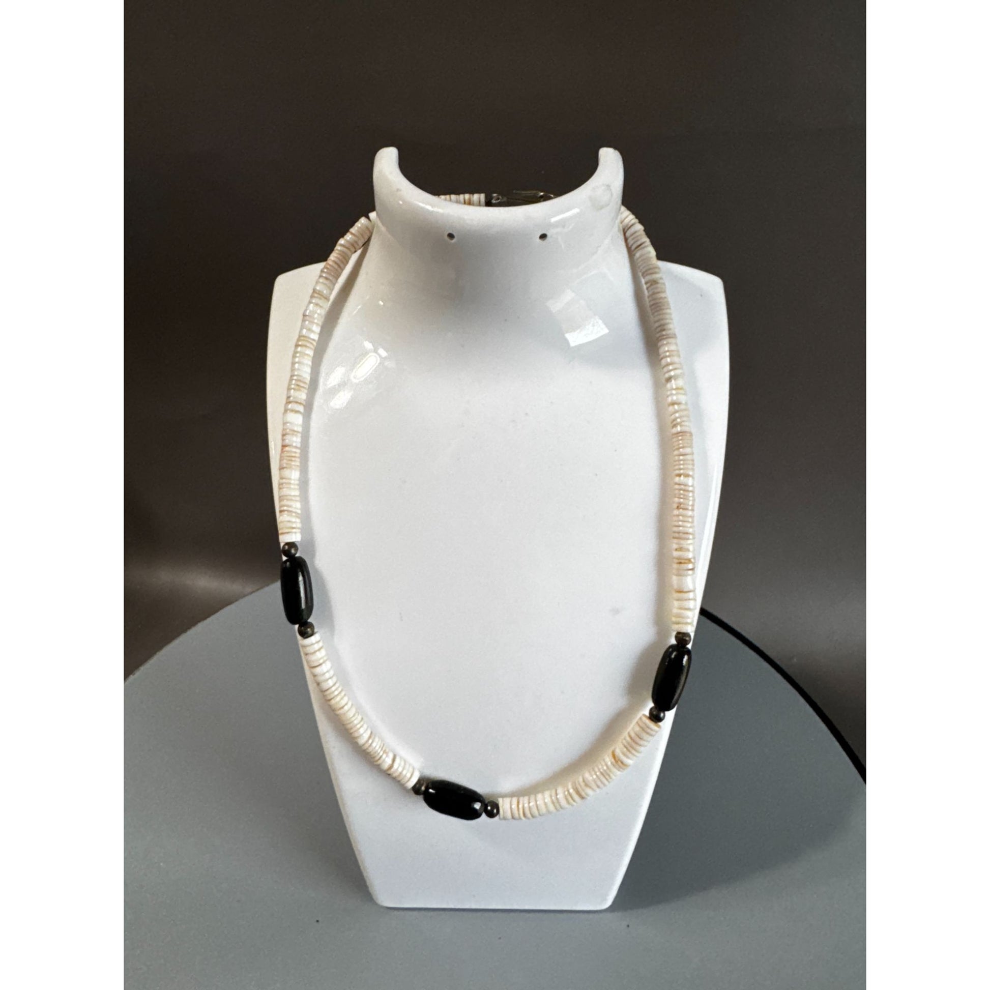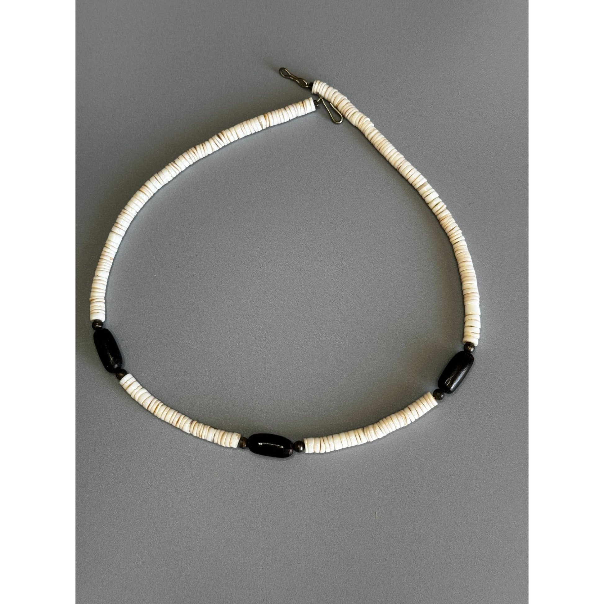 Vintage 17" shell bead necklace featuring 5mm white spiny oyster heishi and larger black dyed shell barrel beads separated by small metal spacers. Hook clasp is base metal and functions well. One black bead shows a tiny area where the natural red shell is visible under magnification, not noticeable when worn. Excellent vintage condition overall with secure stringing.