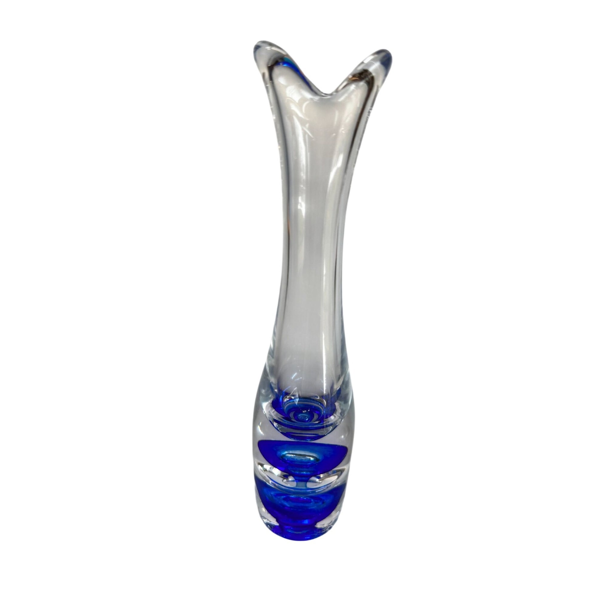 Stunning vintage Swedish Vas Vitreum crystal bud vase, hand-blown in Vadstena, Sweden. This piece features rich cobalt blue “controlled bubbles” encased in clear crystal, giving it that classic Scandinavian art glass look from every angle. Signature/etching is present on the bottom (very faint) and there appears to be a style number that may read “717” (not 100% certain). Includes a gift box (not the original retail box).